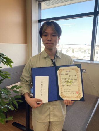 榎本涼平くんが弊所の本年度の所内表彰(最優秀学生賞)されました。おめでとうございます!受賞理由:「ピラゾロン型配位子を有する新規発光性希土類錯体の合成と光学特性評価」